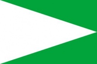 Su bandera es un paño de color verde, con un triángulo isósceles de color blanco, cuya base coincide con el lado del asta de la bandera, y cuyo vértice coincide con el centro del lado del batiente.