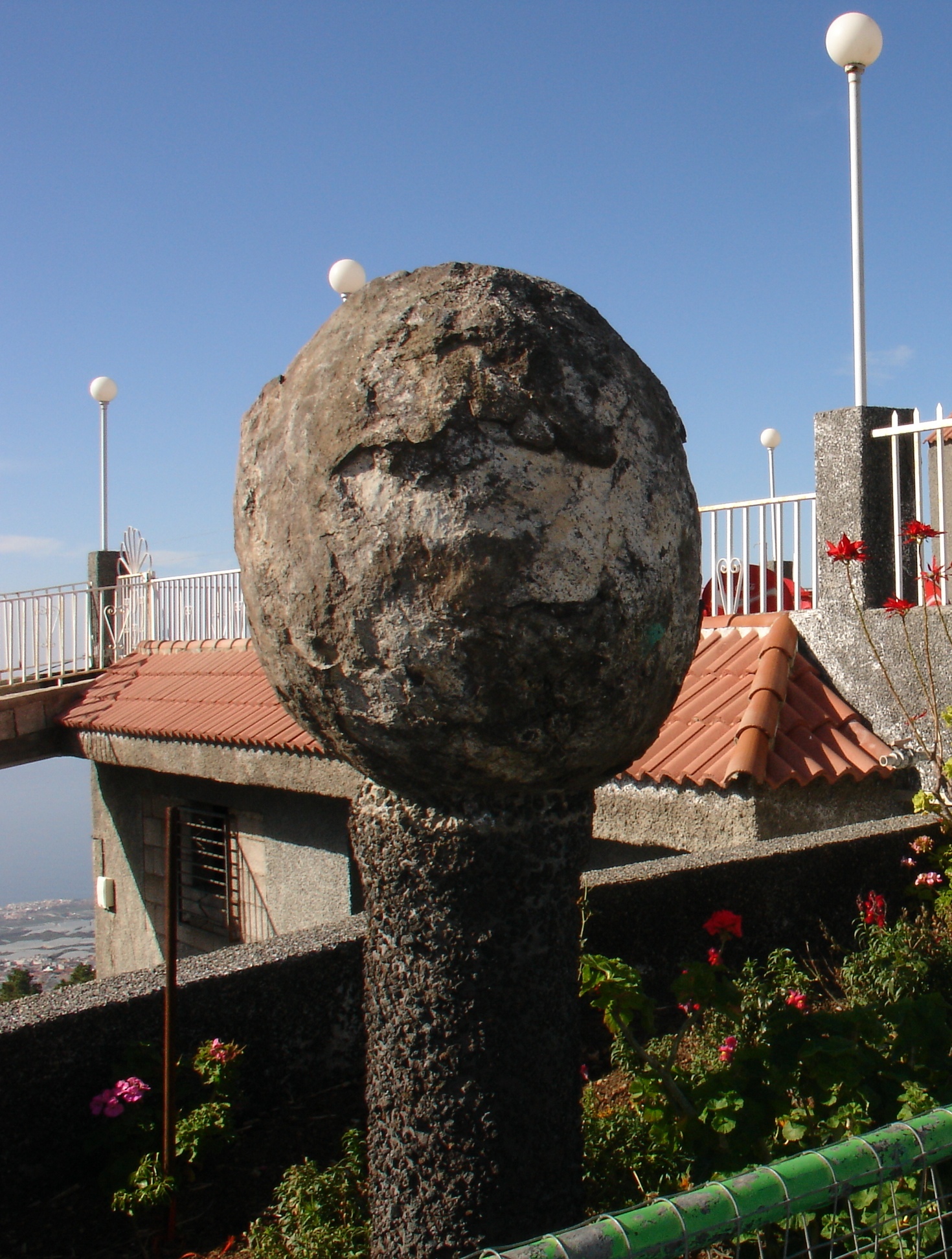 Ejemplo de Bomba Volcánica (Piroclastos de más de 64 mm) expuesta sobre pedestal en la subida al Teide, Isla de Tenerife, España, carretera C-823 desde Chio. Localización exacta Restaurante La Estrella, N 28°13'46,0" W 16°45'35,4", Altitud 1102 m.